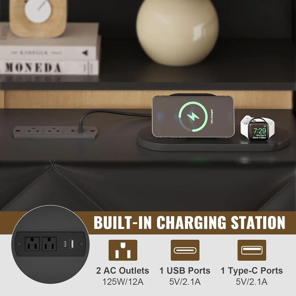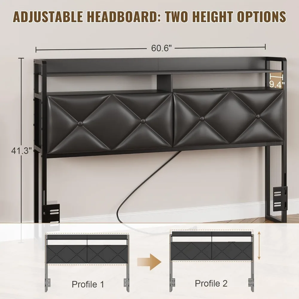 Headboard Queen Size with 2-Tier Open Space and Pull-Out Hidden Storage, Upholstered Headboard with Charging Station, Height Adj