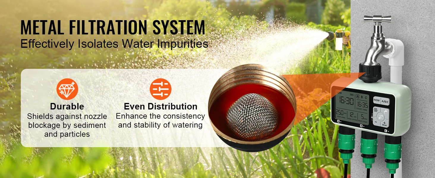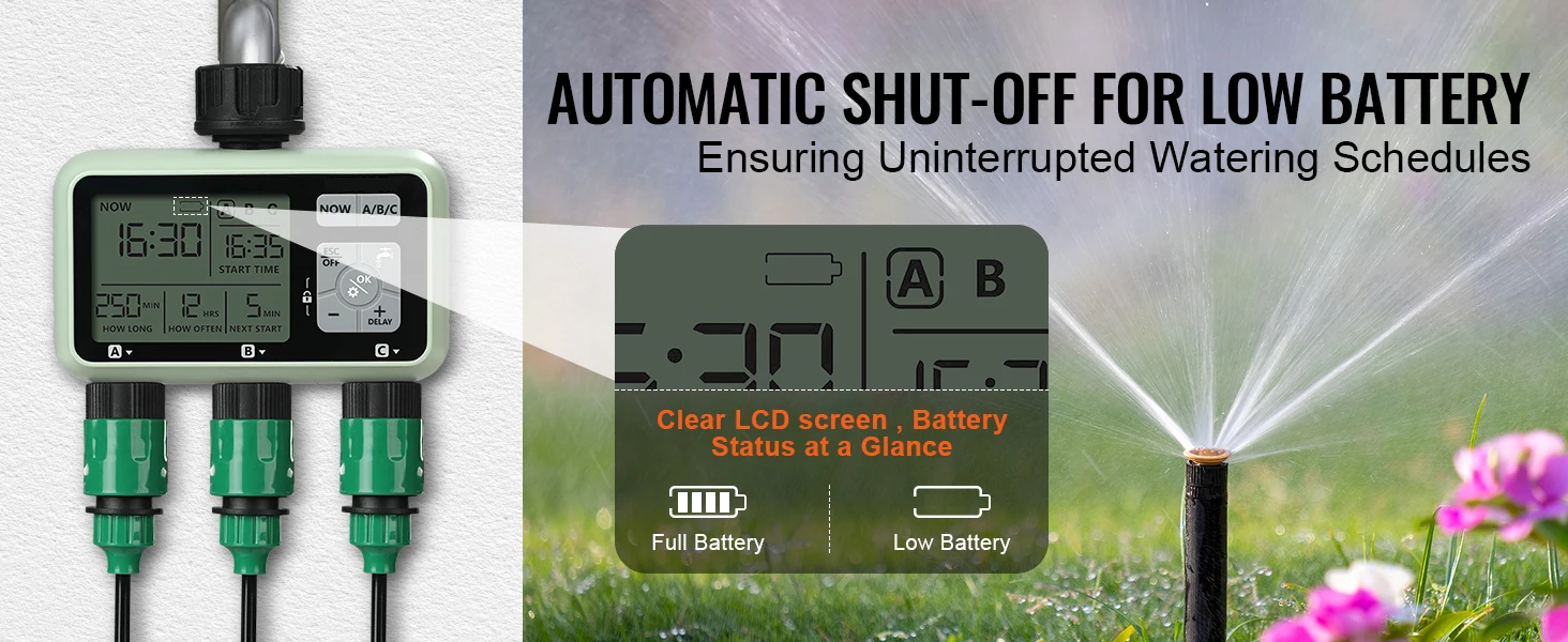 3 Independent Watering Zones: Our sprinkler water timer features 3 separate water outlets, each programmable using the "A/B/C" buttons. Customize watering schedules for each zone independently, ensuring no interference between them. It allows for efficient management of large-scale irrigation, saving you time and effort in garden or farm maintenance.